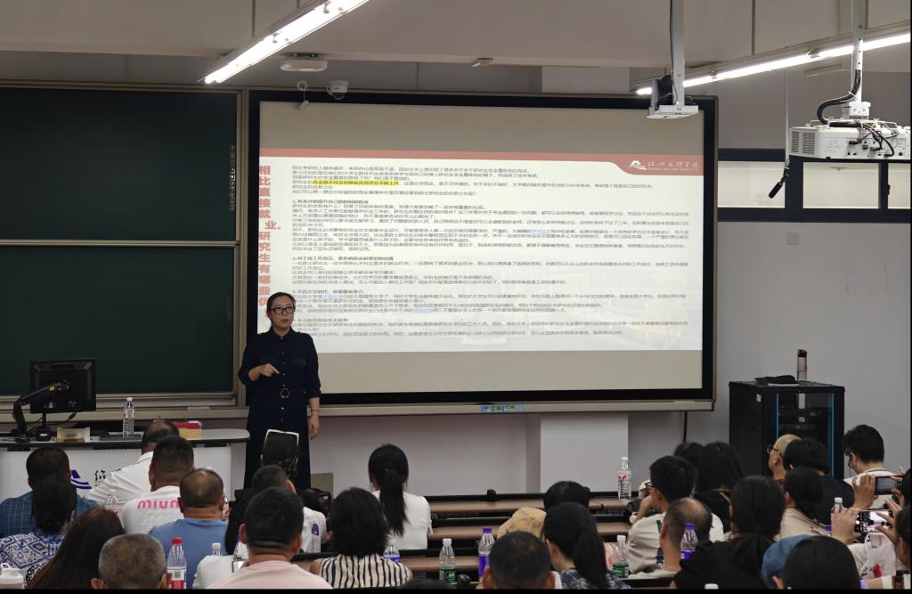 刘志欣副书记代表学院向2025级新生的到来表示热烈欢迎,并向各位家长致以诚挚感谢。她系统介绍了学院的基本情况,尤其围绕大学生活适应、专业学习路径、就业前景、职业生涯规划等家长普遍关心的话题展开详细解读。她结合近几年学院各专业的考研录取情况及毕业生就业数据,以真实案例为依据,分析了当前就业形势与研究生招考趋势,指出无论是继续深造、报考公职、出国留学还是直接就业,每一条路径都需提前规划和扎实准备。她呼吁家长在孩子的大学四年中,既要适当放手,鼓励其自主面对挑战,也要持续关注其成长动态,与学校携手共同助力学生全面成长。